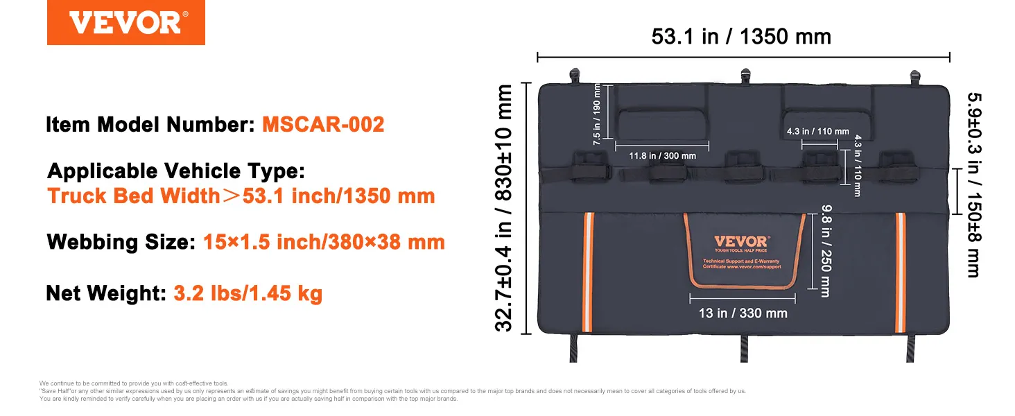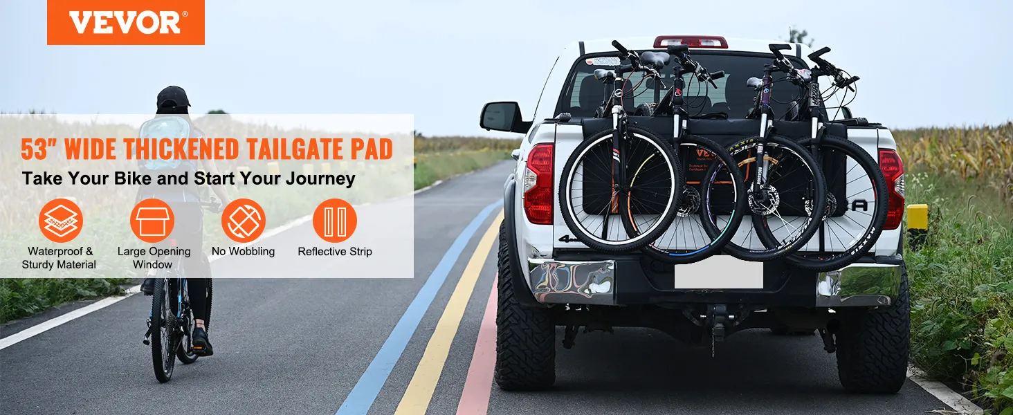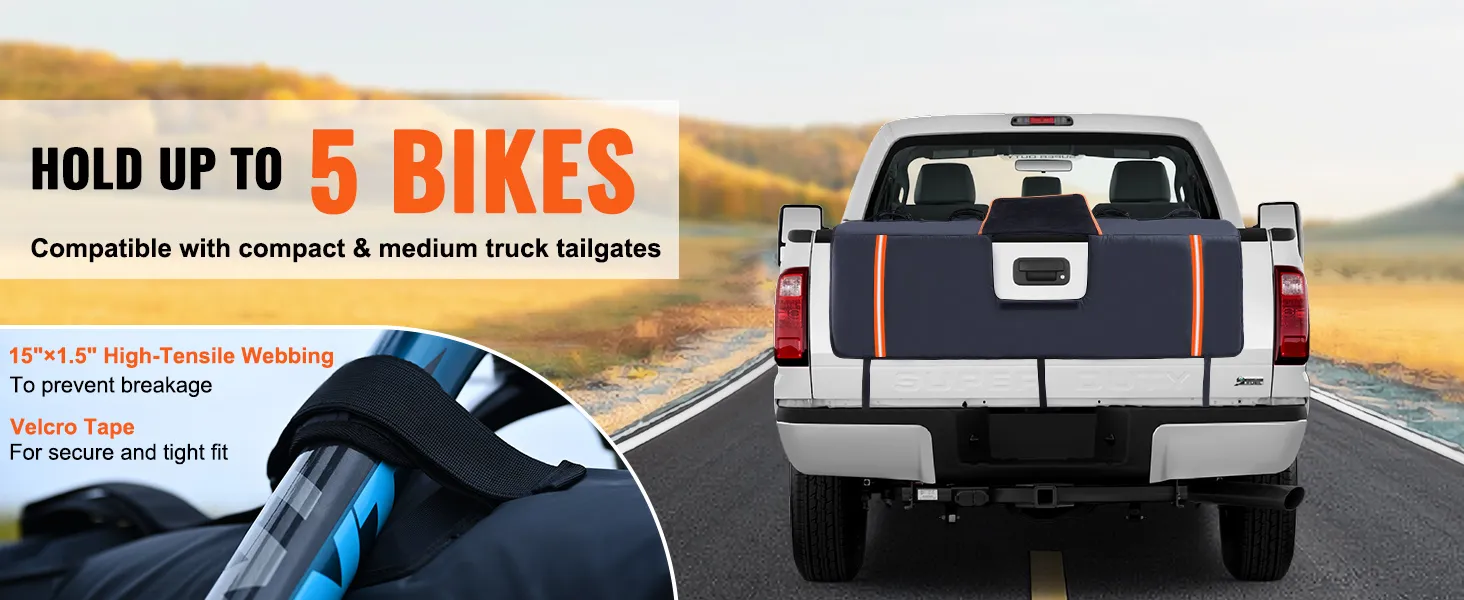 - Coussin de protection pour hayon de camion à 5 vélos : notre coussin de protection pour hayon de camion de 53,1 pouces de large avec 5 dispositifs de fixation s'adapte à la plupart des camions compacts et de taille moyenne de plus de 53,1 pouces/1350 mm et peut transporter jusqu'à 5 vélos en toute sécurité. Le coussin de protection pour hayon est un partenaire polyvalent qui peut transporter non seulement des vélos, mais aussi des kayaks, du bois, des échelles et plus encore.